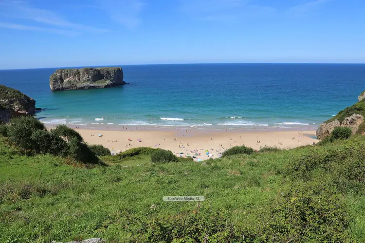 Playas | Llanes | La playa de Buelna o Playa de Buelna - Las Arenillas, tranquila en pleamar, se constituyó a partir de formaciones calizas erosionadas que dieron lugar a una sucesión de depresiones, con las que contrasta un espectacular pináculo calcáreo en su salida al mar. Nota la asistencia masiva de quienes escogen la población rural de Buelna para el veraneo. Características generales: Longitud playa: 50 metros Anchura media: 20